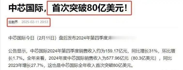 2024年,中芯国际全年的营收达到了577.96亿元,同比上涨了27.%,是中芯国际有史以来,第一次突破了80亿美元大关。